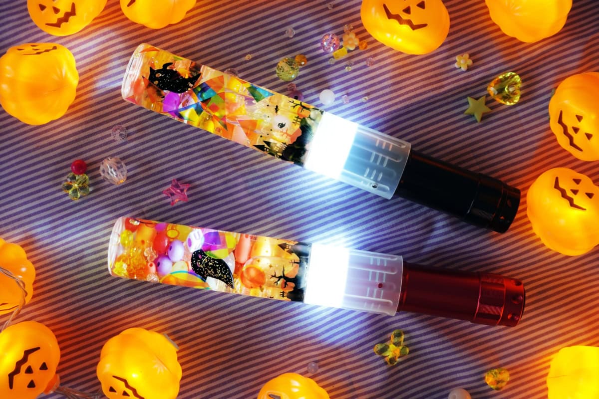 ハロウィン仕様のカラフルなビーズやラメを入れて、イベントにぴったりのライトを作ろう!