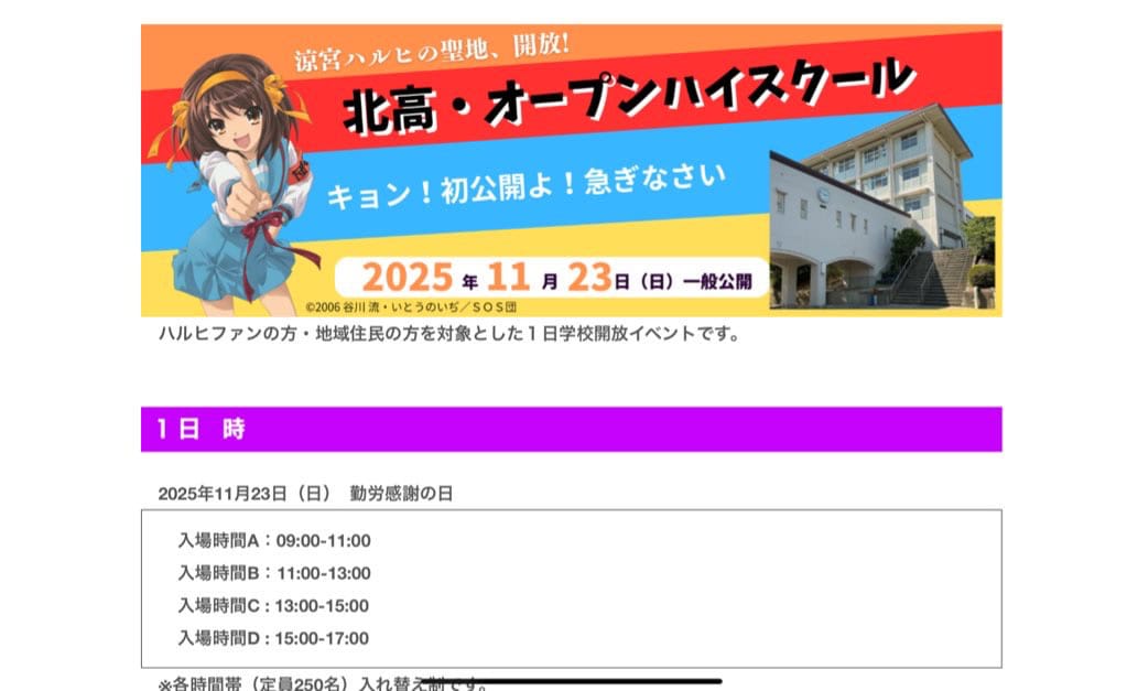 なんとなんと「涼宮ハルヒの憂鬱」の西宮北高校がハルヒファンのために開放されるみたいです!