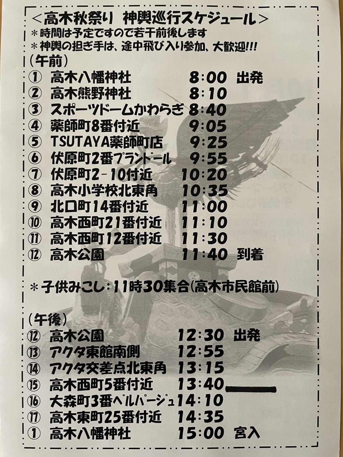 集合:7:15 高木西町八幡神社 → 出発:8:00 → 宮入:15:00ごろ解散。休憩は約20分おき、昼は11:45ごろ高木公園でおにぎり&カップ麺あります。終わったら17:00〜19:00でお疲れ様会も!