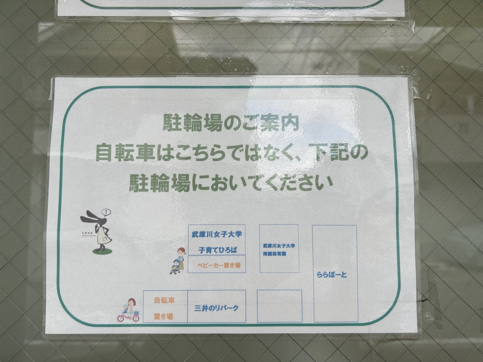 駐輪場は子育てひろばから50mほど歩いたところにあります。ベビーカーで来られた方は子育てひろばの前に止めてくださいね。