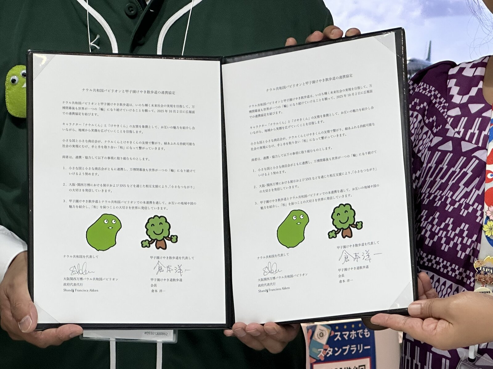 「小さな国」と「小さな商店街」が手を取り合うって単純に聞こえますが、万博会場で政府代表代理の方が出席されて、調印式が開かれるって、なんだかすごいと思います。こうした形で気軽に連携してくれるのが「ナウル共和国」のいいところ。みなさんもぜひ「甲子園けやき散歩道」へ行ってみてください~!