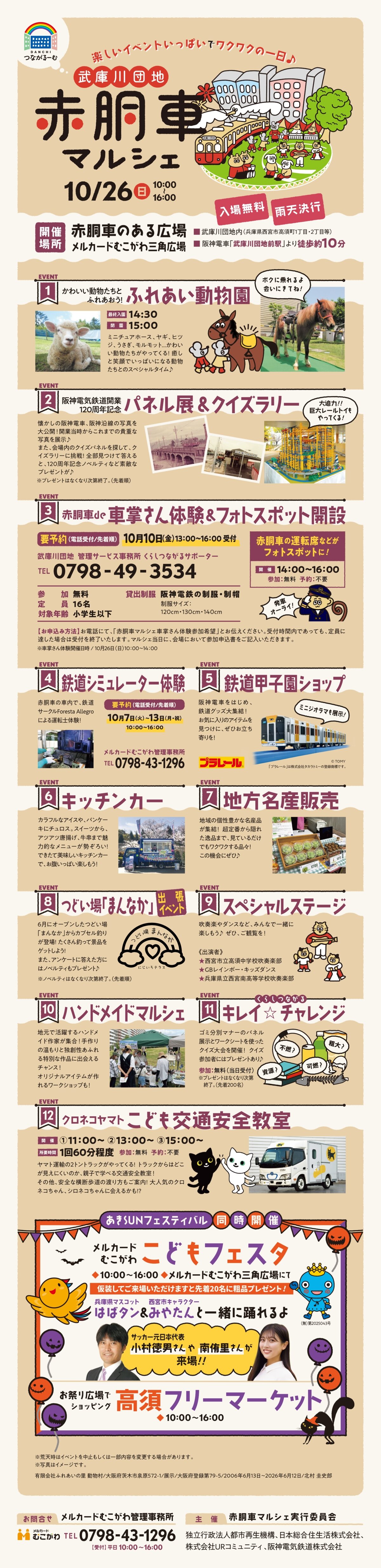 ムコダンの恒例ビッグイベント「赤胴車マルシェ&こどもフェスタ」。ムコダン住みじゃなくても気軽に立ち寄れて楽しめるイベントですよ〜。とにかく会場が広くて、コンテンツもりだくさんなので、一日中のんびり遊べます😄大人気の車掌体験は先着の事前予約制なので、やりたい方は早めに申し込んでくださいね〜