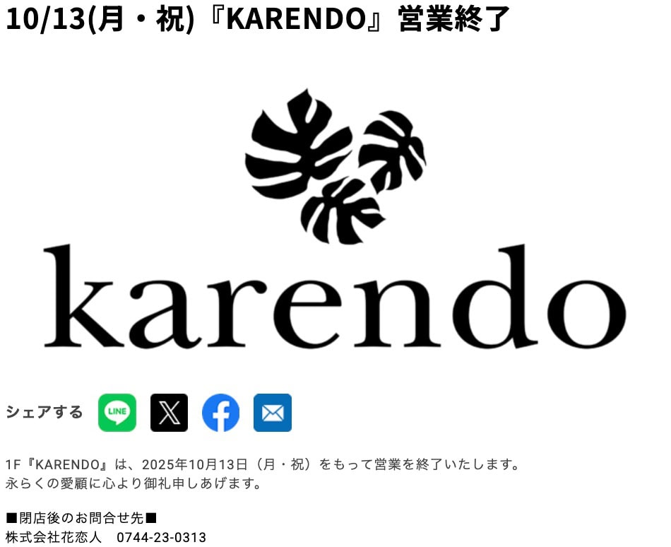 ららぽーと甲子園のフラワーショップ「KARENDO(カレンド)」が10月13日(月・祝)で閉店するようです。