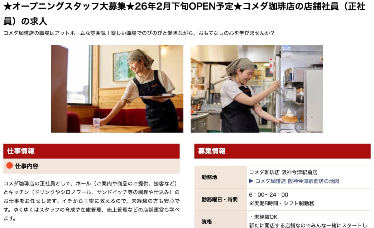 コメダ珈琲店 阪神今津駅前店 店舗スタッフ【正社員】★26年2月下旬OPEN予定★の求人詳細 【公式】コメダ珈琲店 アルバイト・パート・正社員 求人サイト (おかげ庵・KOMEDA is□など)より引用