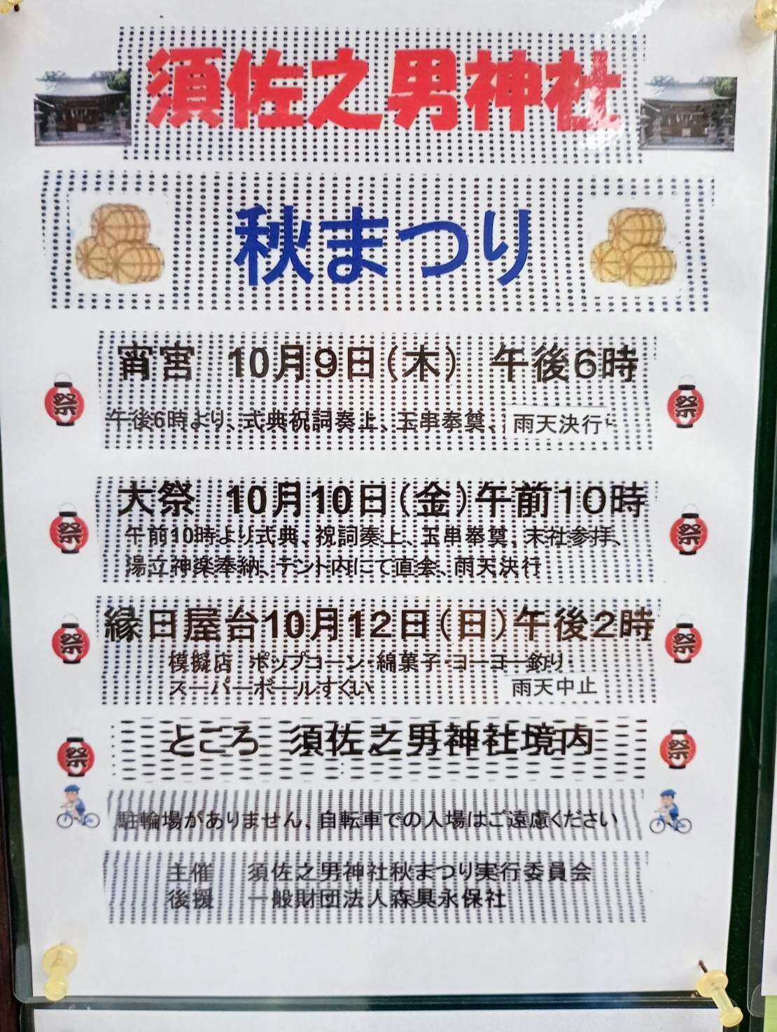 10月12日(日)、須佐之男神社で「秋まつり」が開催されるようです。