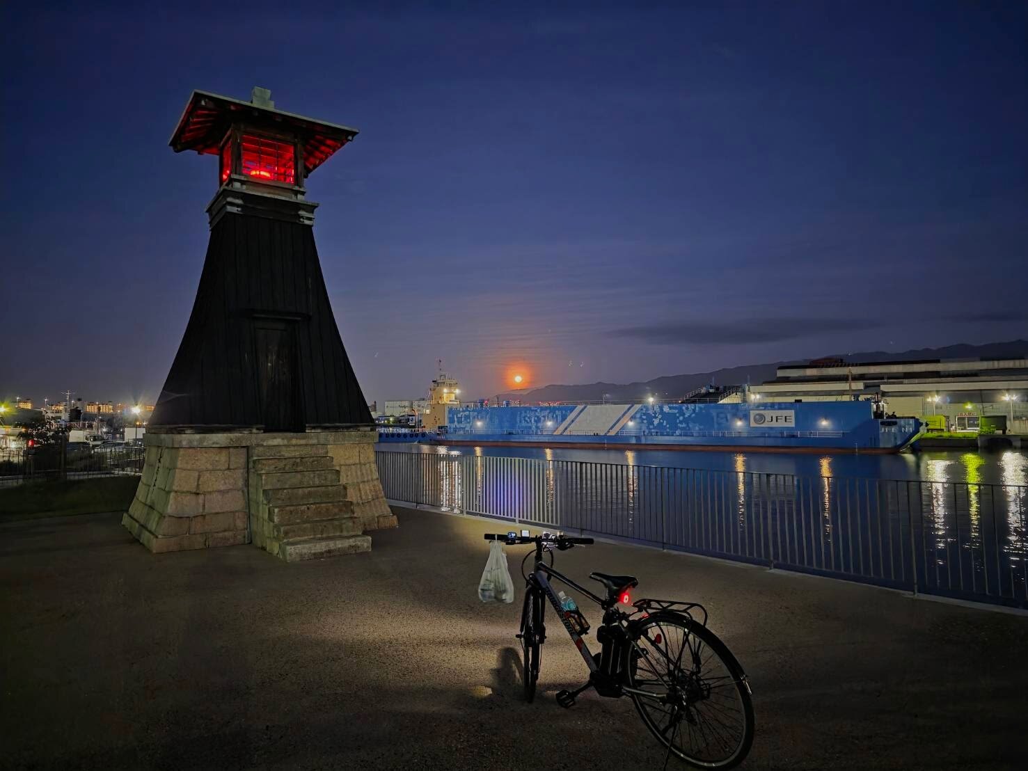 月ってスマホ撮影難しいのですが、10月6日の夕方。場所は今津浜から六甲山(今津灯台)を撮影。川の巨大な船はJFEスチールらしいです〜。