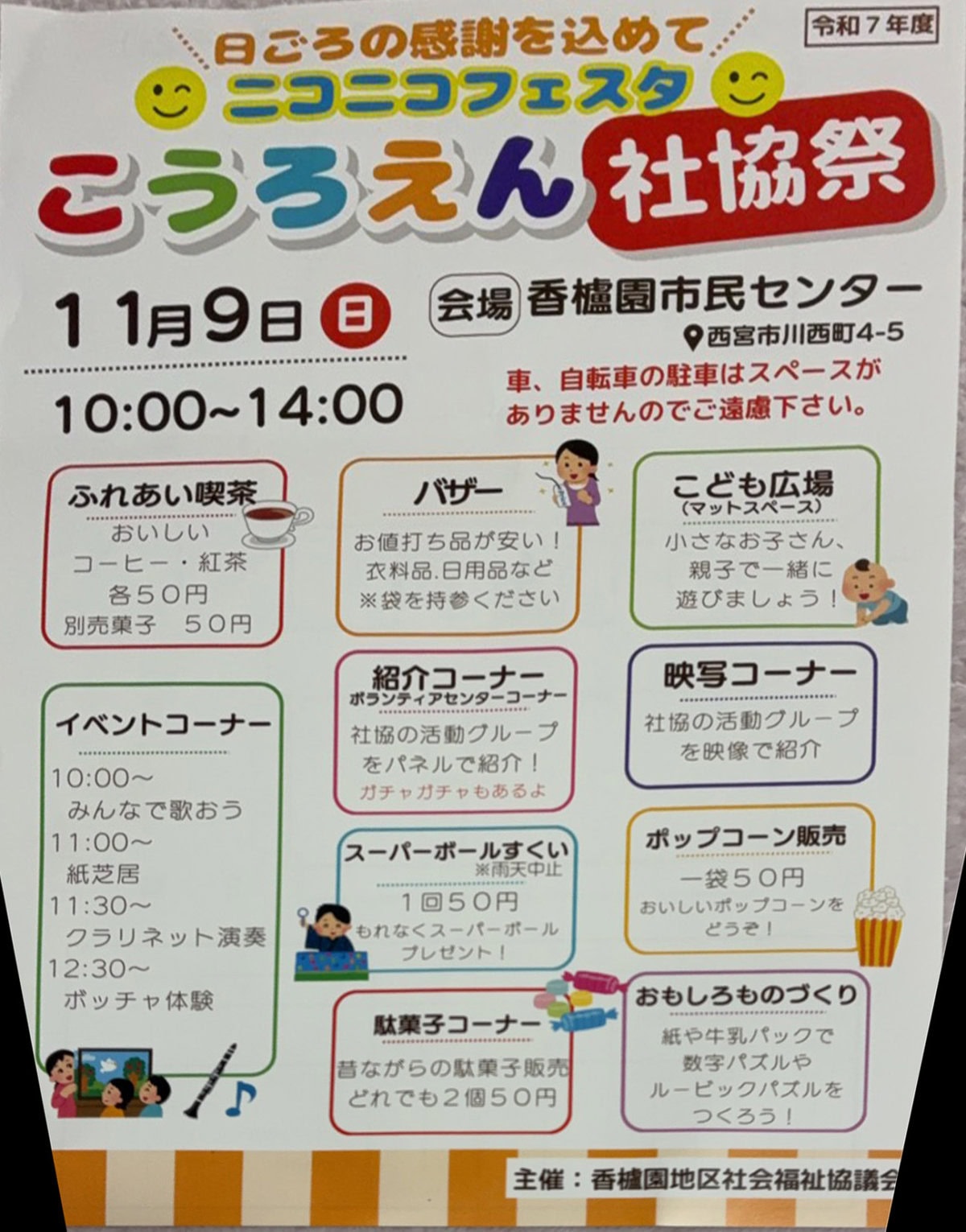 11月9日(日)、香櫨園市民センターで「ニコニコフェスタ こうろえん社協祭」が開催されるようです。