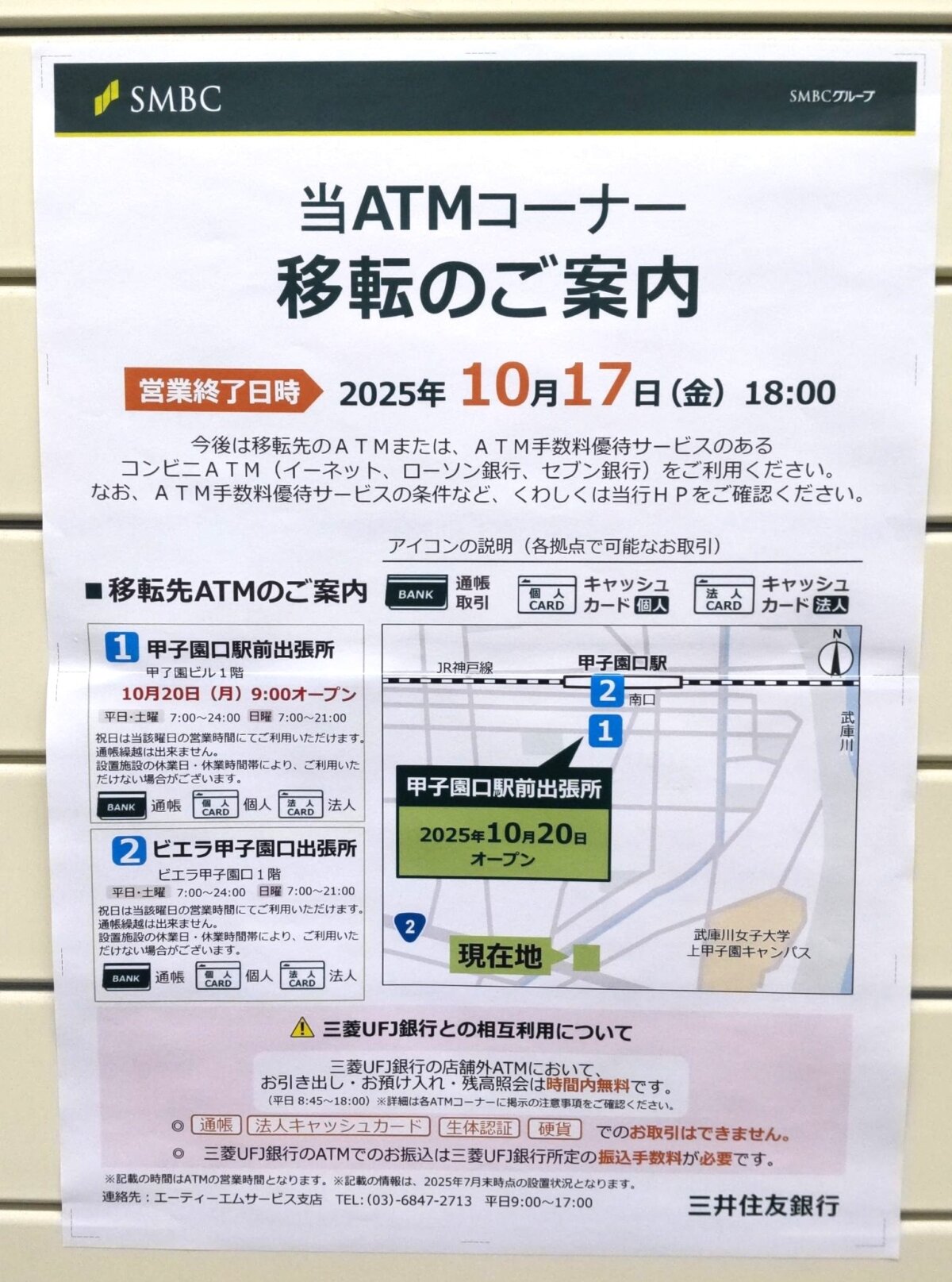 甲子園口駅前にはもともと、駅ビル・ビエラ甲子園口の1Fにも三井住友銀行のATMがあります。これで駅前はさらに便利になりますが、2号線の方で利用していた方にとっては少し不便になりそうですね。移転後、2号線沿いの三井住友の建物がどうなるのかも気になるところ。何か新しいお店ができるのか、こちらも楽しみですね〜😃