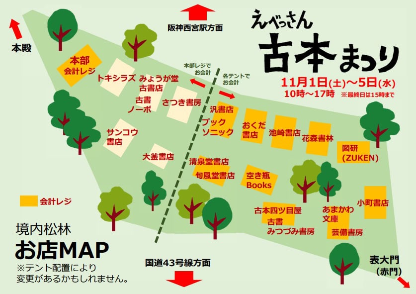 全20店の古書店のテントが西宮神社の中に並びます〜📚今年初参加のお店もあるみたいですよ😄