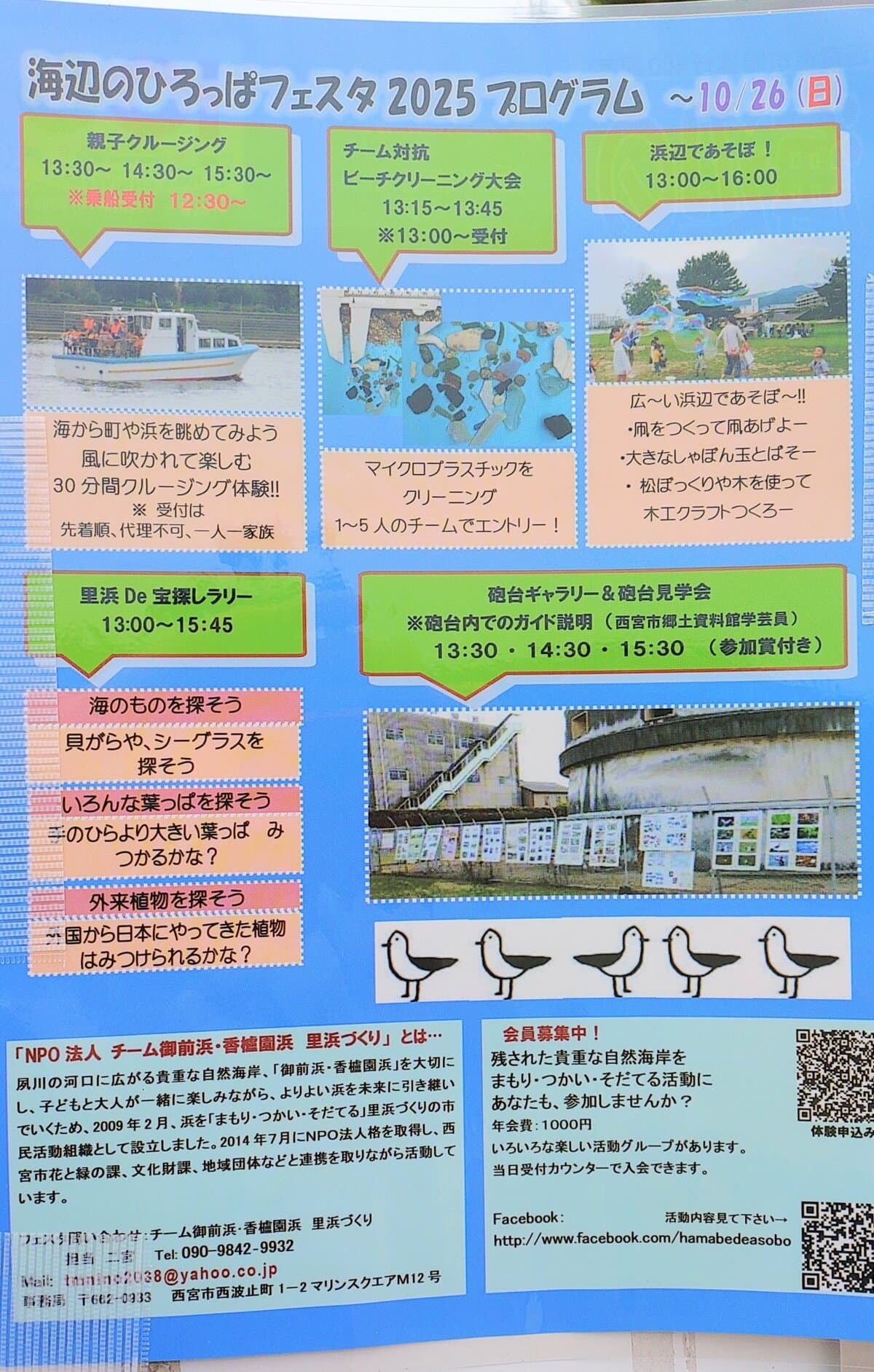 10月26日(日)、御前浜公園 西宮砲台付近で「海辺のひろっぱフェスタ2025」が開催されるようです。