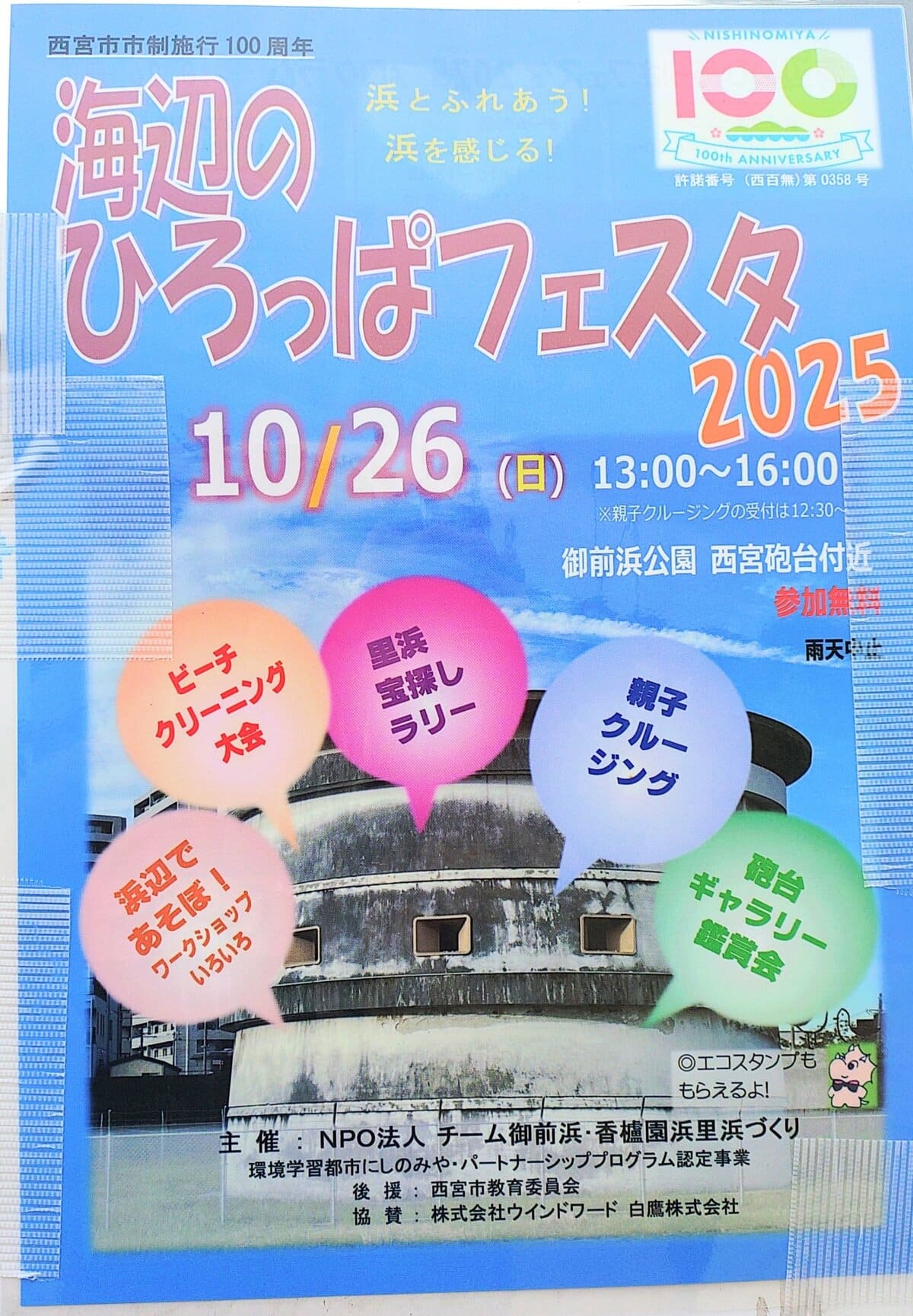 10月26日(日)、御前浜公園 西宮砲台付近で「海辺のひろっぱフェスタ2025」が開催されるようです。