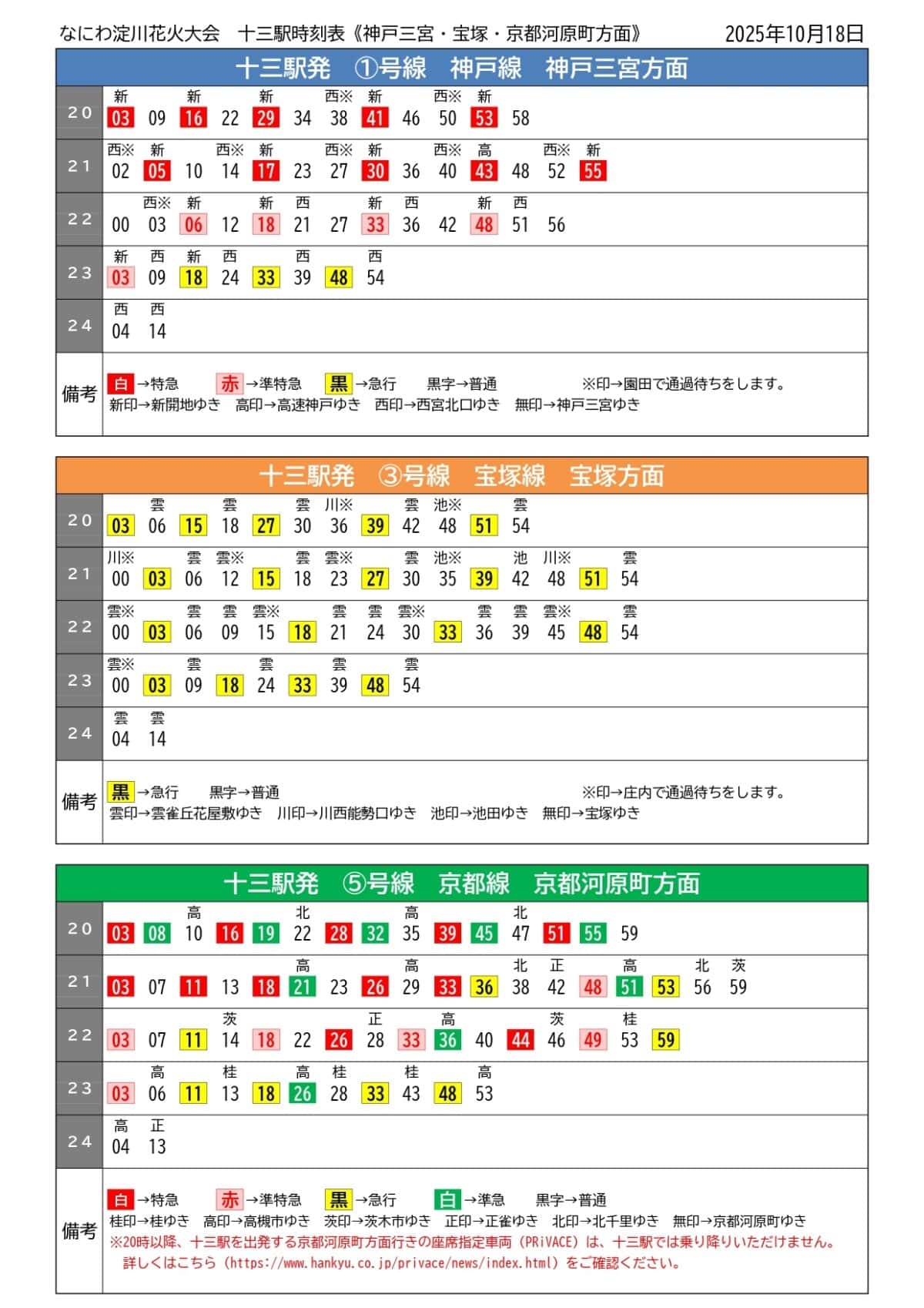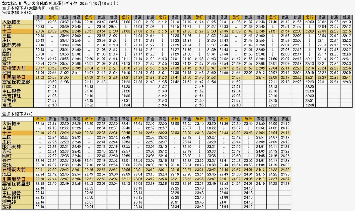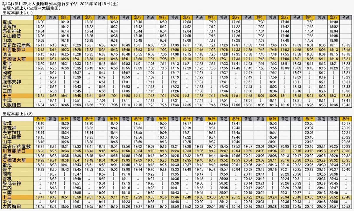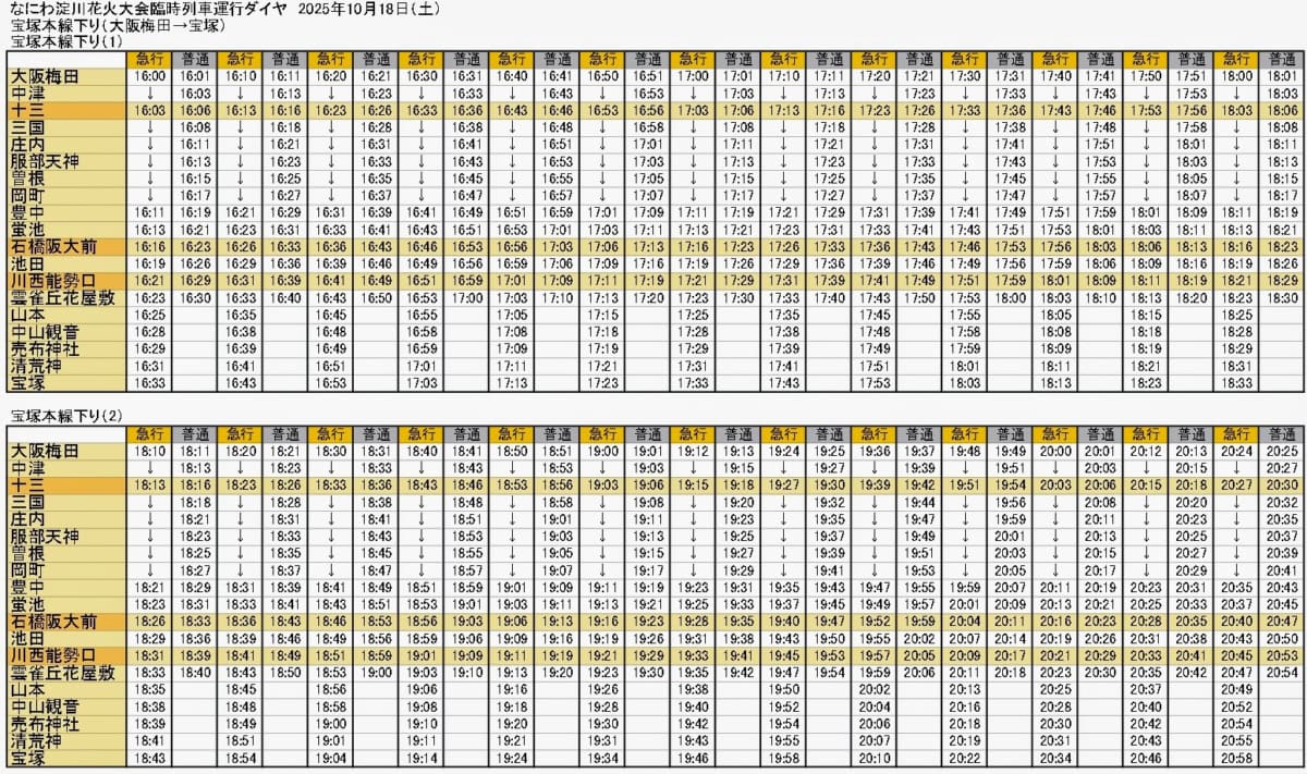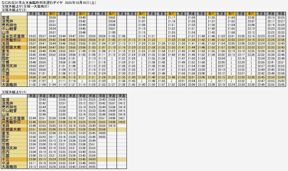 以下ダイヤ情報は『なにわ淀川花⽕⼤会』開催に伴う臨時列⾞の運転について | 阪急電鉄からのお知らせ | 阪急電鉄より引用しています。