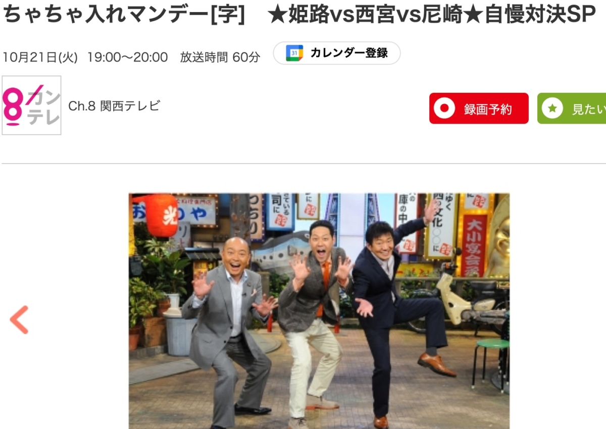 10月21日(火)19時00分~放送「ちゃちゃ入れマンデー」で、西宮・尼崎・姫路が対決するようです。