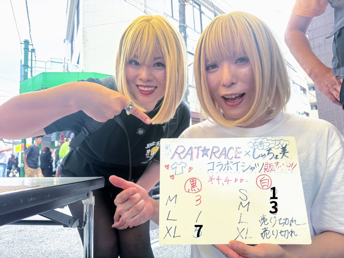 ちょちょ美としゃちょ美で登場します〜。よかったらTシャツ買って!買ってって〜サイズ別の在庫の数です11〜14時くらいまでいます