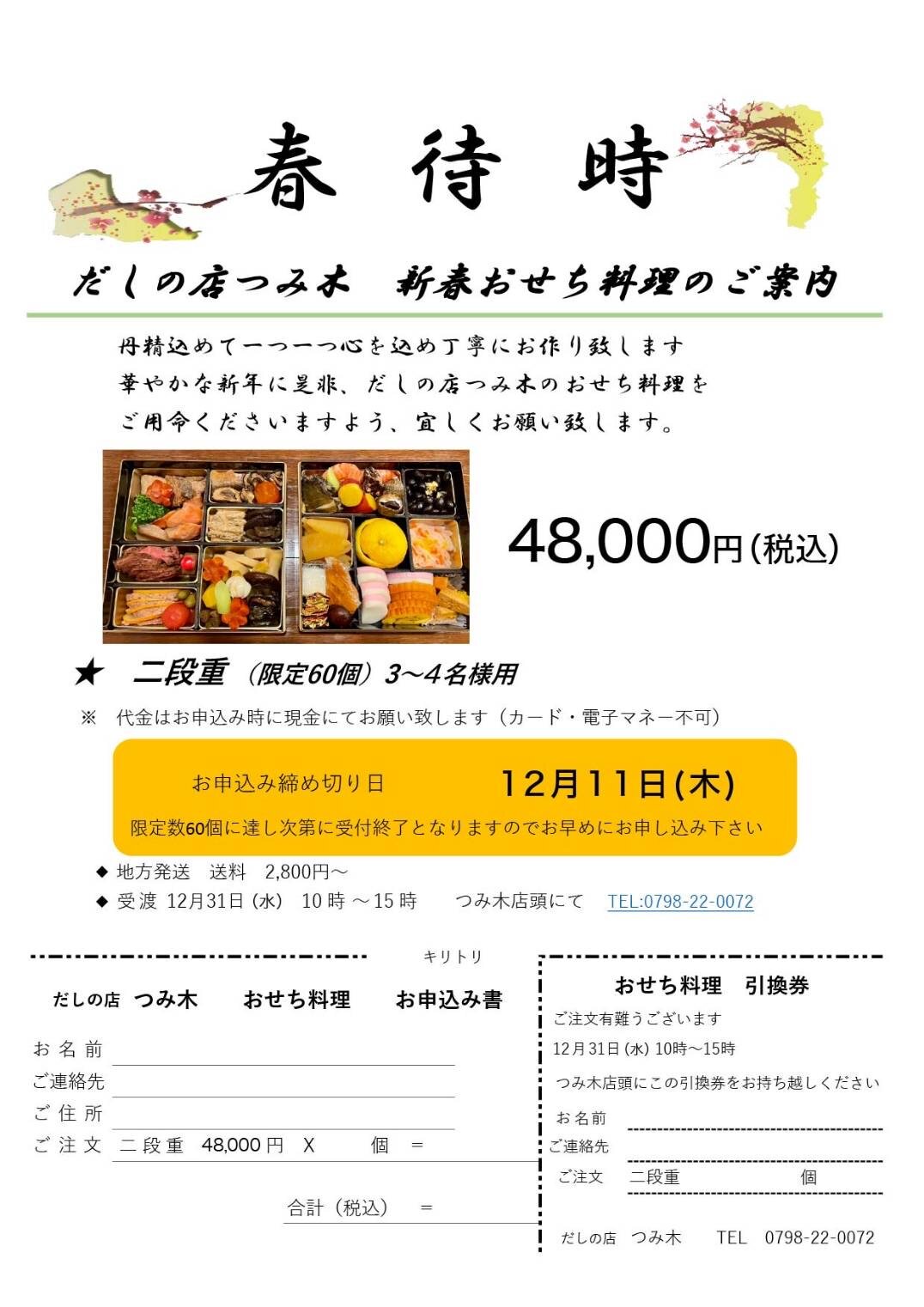 - 電話する:0798-22-0072(「おせち予約の件」と伝えてください)