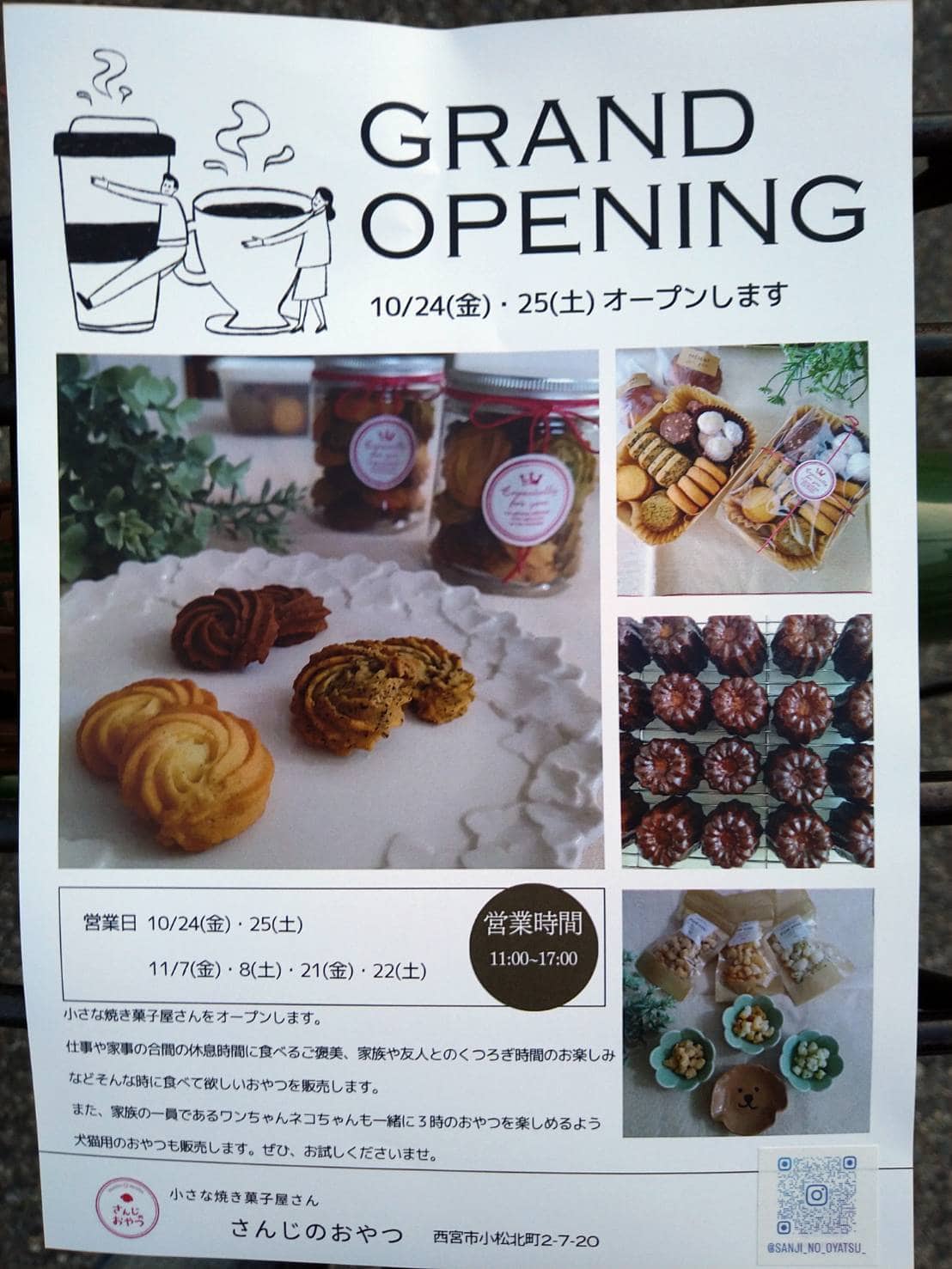 今日10月24日(金)から、老松公園近く小松北町に「小さな焼き菓子屋 さんじのおやつ」がオープンするようです。