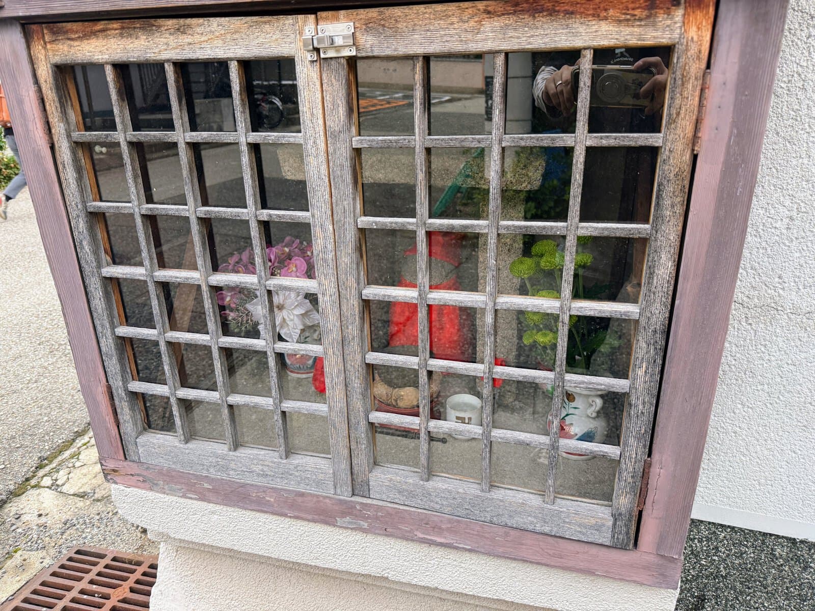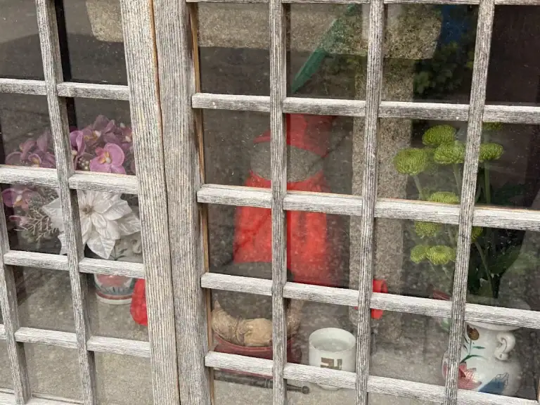 中には石のほこらがあり、赤い前掛けをつけたお地蔵様がいらっしゃいます。かわいい〜
