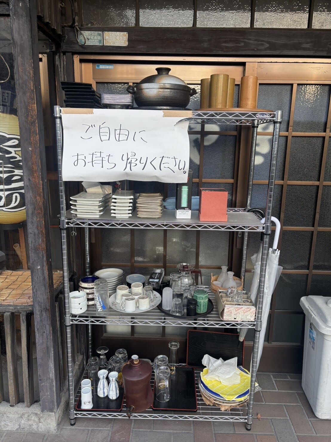 10月17日に閉店した甲子園口駅前の「やき鳥 たくみ」が食器を無料で配っているようです。