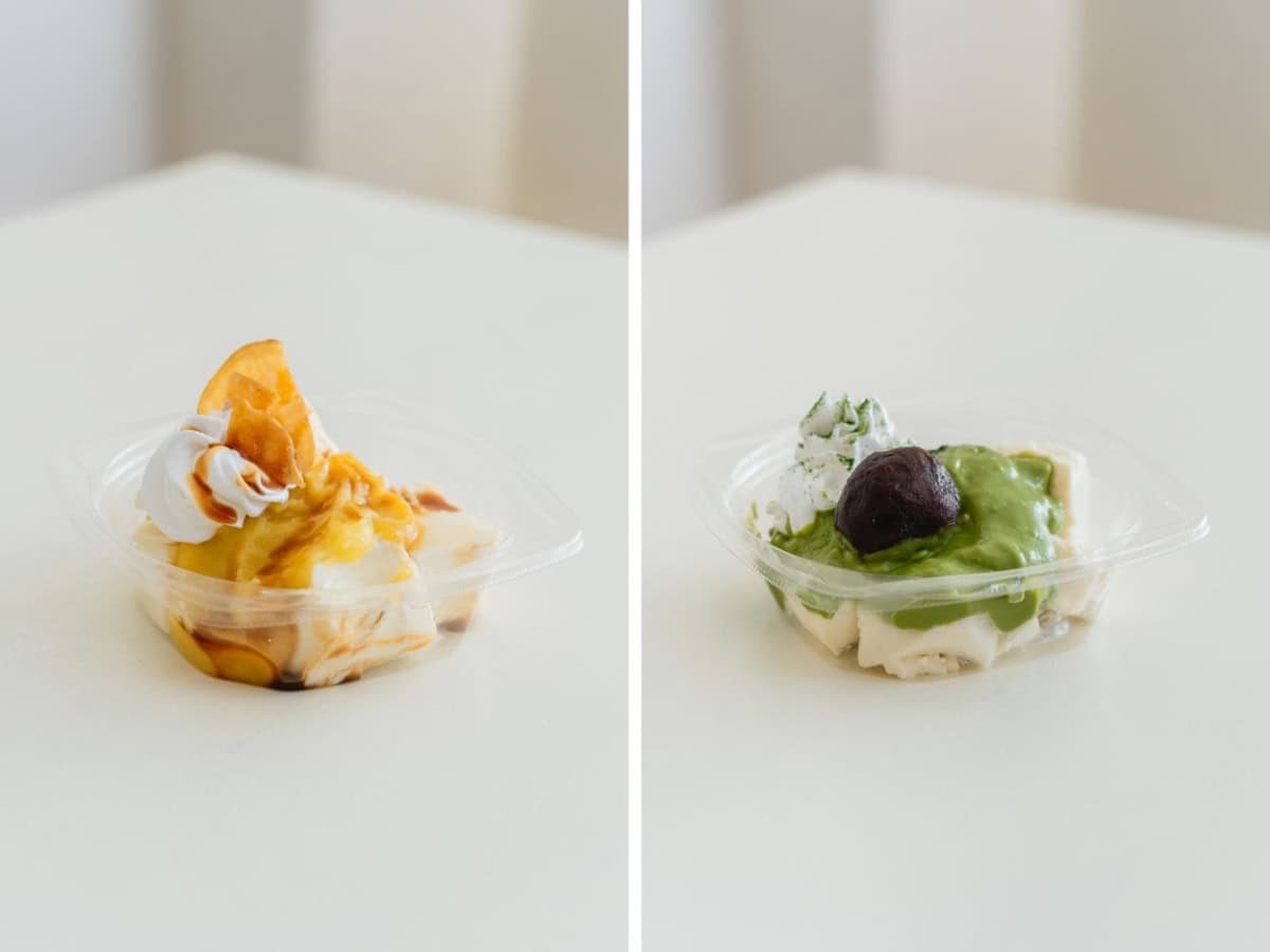 - 抹茶あんこ 豆富:クリーミーな自家製豆富に、抹茶ムース・あんこ・ホイップ。和の王道コンビで間違いなし。