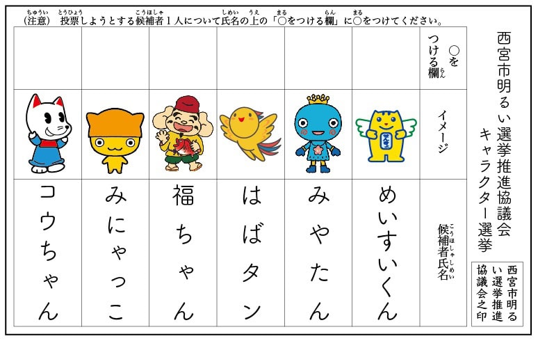 こんな感じで西宮のキャラクター1人に◯をつけて投票します。