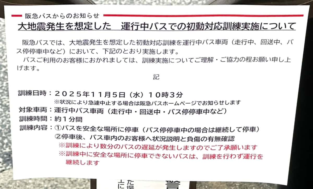 11月5日(水)、西宮市内などを走る阪急バスの車内で「大地震を想定した運行中バスでの初動対応訓練」が開催されるようです。