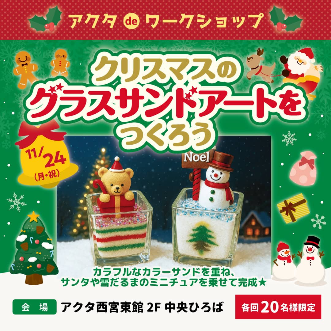 11月24日(月・祝)、アクタ西宮で「クリスマスのグラスサンドアート」が作れるようです。