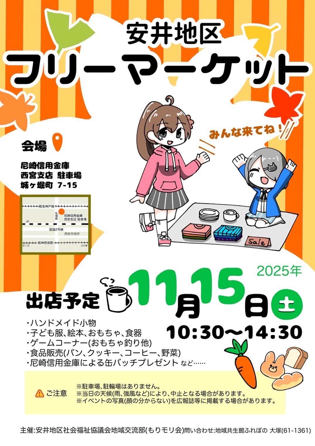 11月15日(土)、国道171号線沿い城ケ堀町にある、尼崎信用金庫 西宮支店で「安井地区フリーマーケット」が開催されるようです。