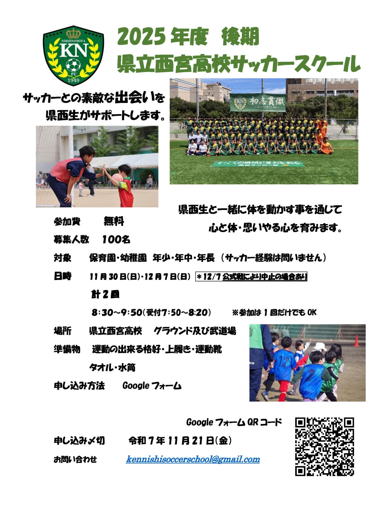 11月30日(日)と12月7日(日)に、県立西宮高校で「2025年度 後期 県立西宮高校サッカースクール」が開催されます〜!