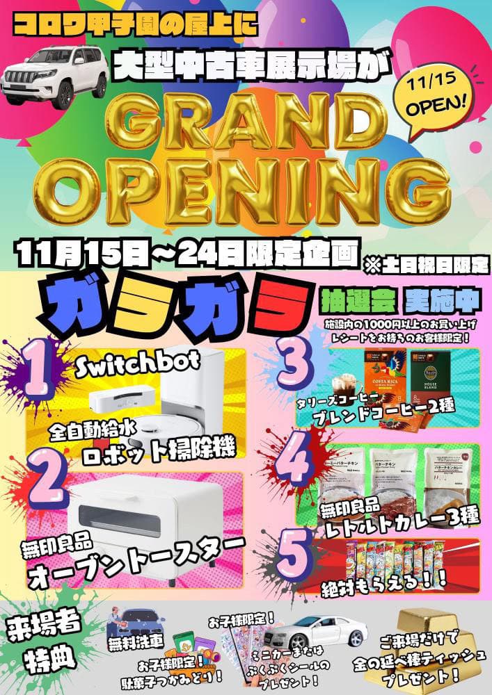 11月15日(土)のグランドオープンから11月24日(月・祝)までの土日祝限定で、とっても豪華な景品が当たる「ガラガラ抽選会」が開催されますよ〜!