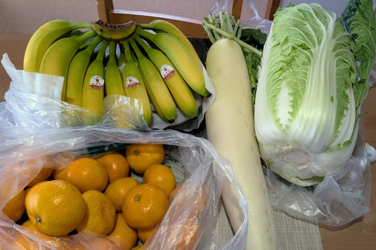 長ネギは細めの4本で100円。バナナは一房15〜20本くらい入ってて300円〜500円!じゃがいもや玉ねぎも袋入りで5個150円くらいとのこと。昨日は白菜・大根も各200円でした。前回より少し高めだったそうですが、それでも安い!