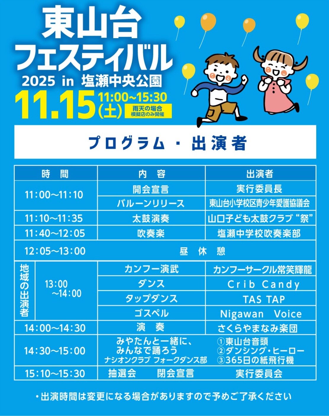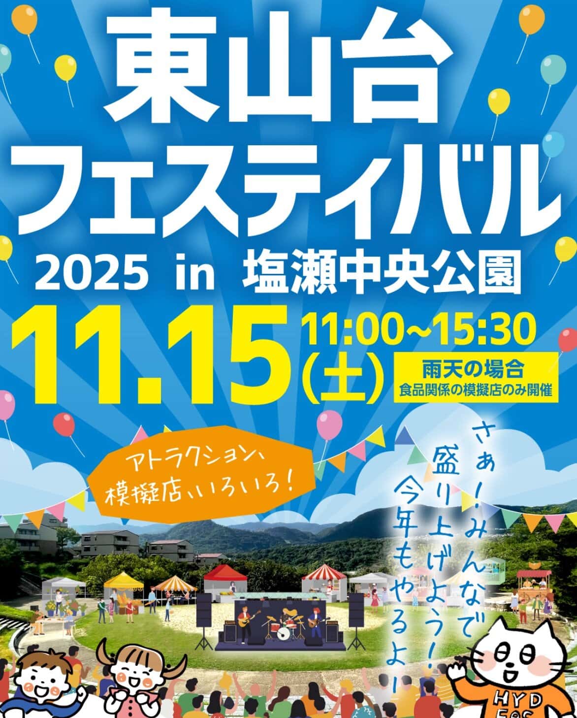 11月15日(土)、塩瀬中央公園で「東山台フェスティバル2025」が開催されるようです。