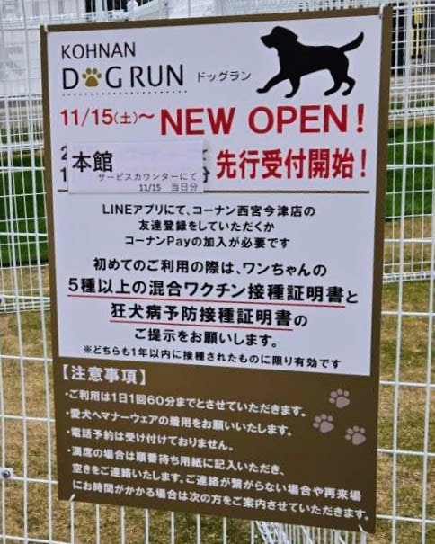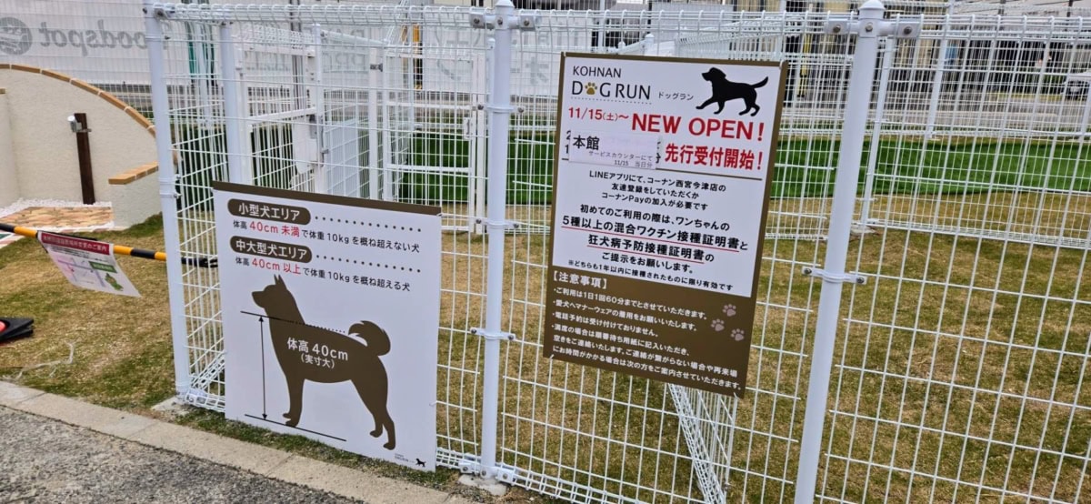 本日11/15にオープンするコーナン今津の駐車場のドッグランの利用方法がでています。