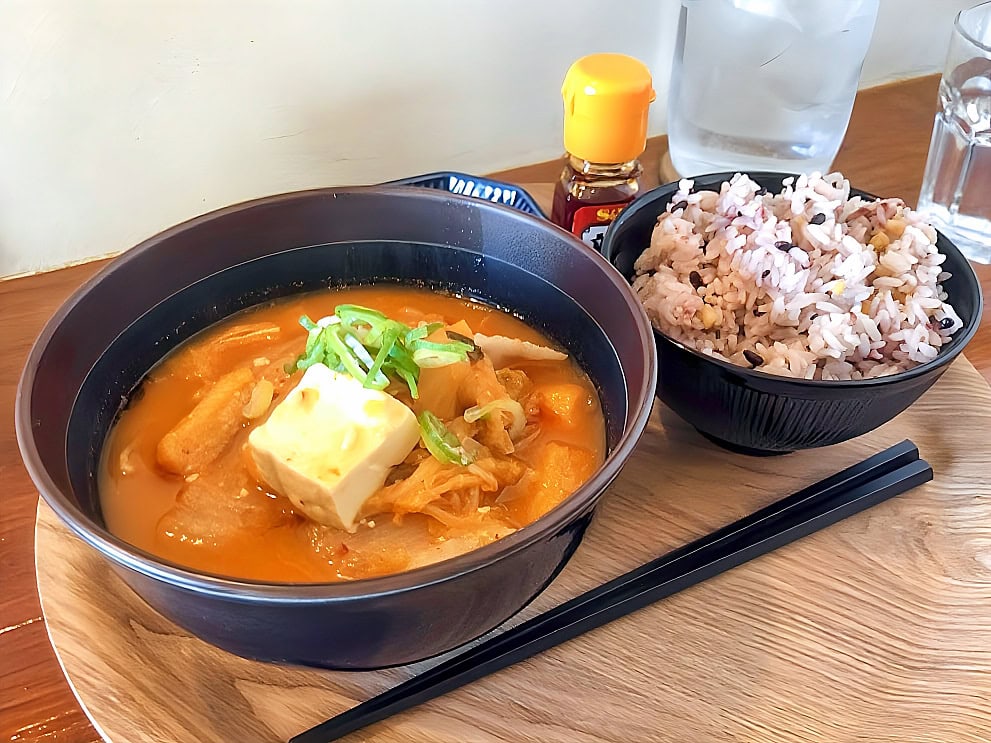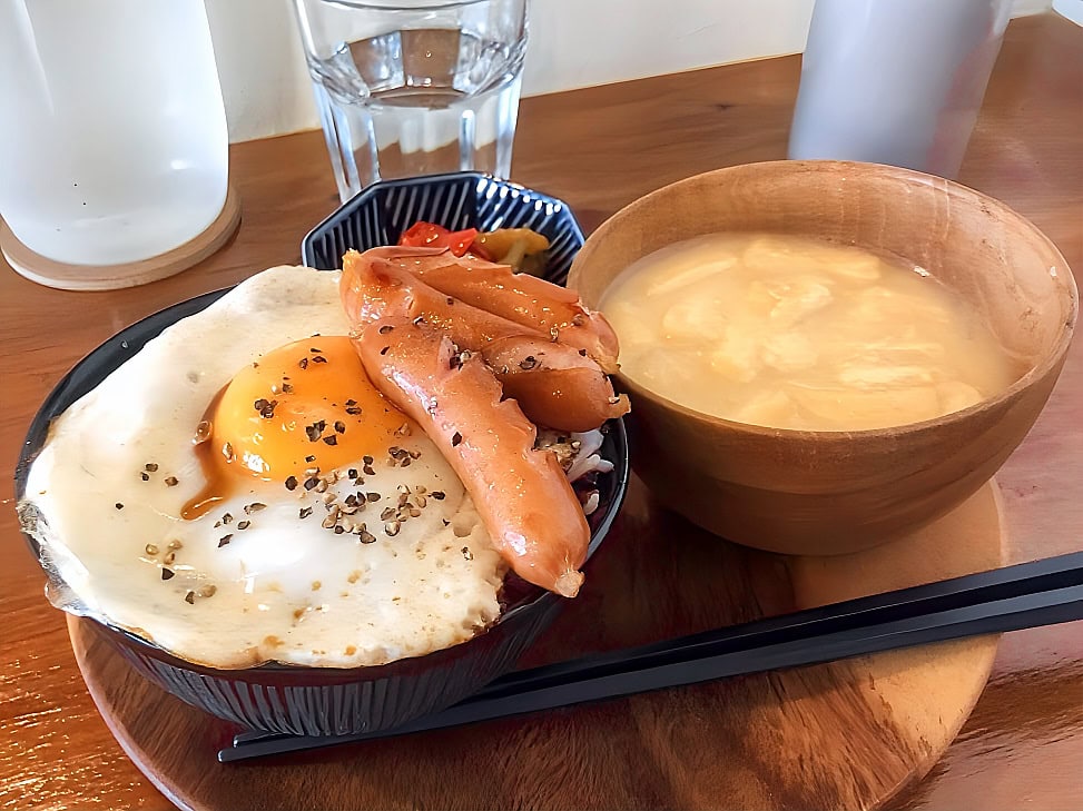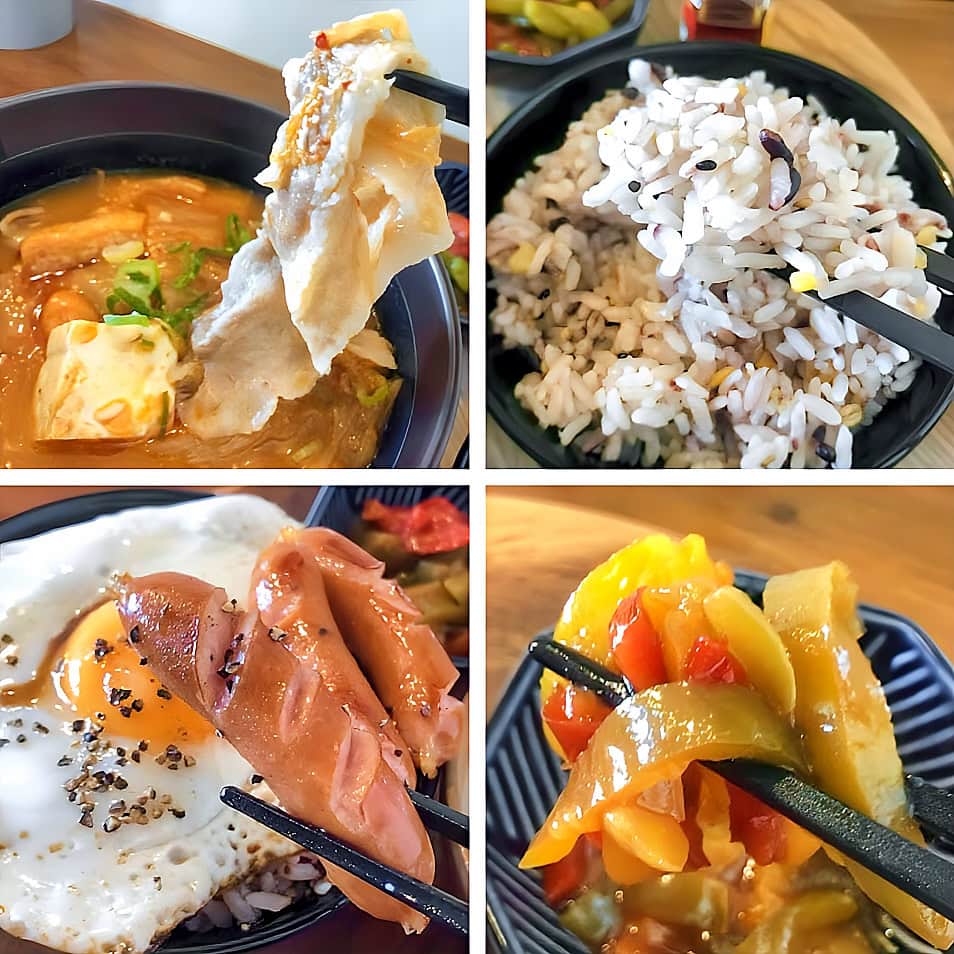 目玉焼きどーん、ソーセージじゅわっ。雑穀米までしっかり食欲そそる〜。大ぶりの豚に具材どっさり。甘辛キムチでぽっかぽか🤗