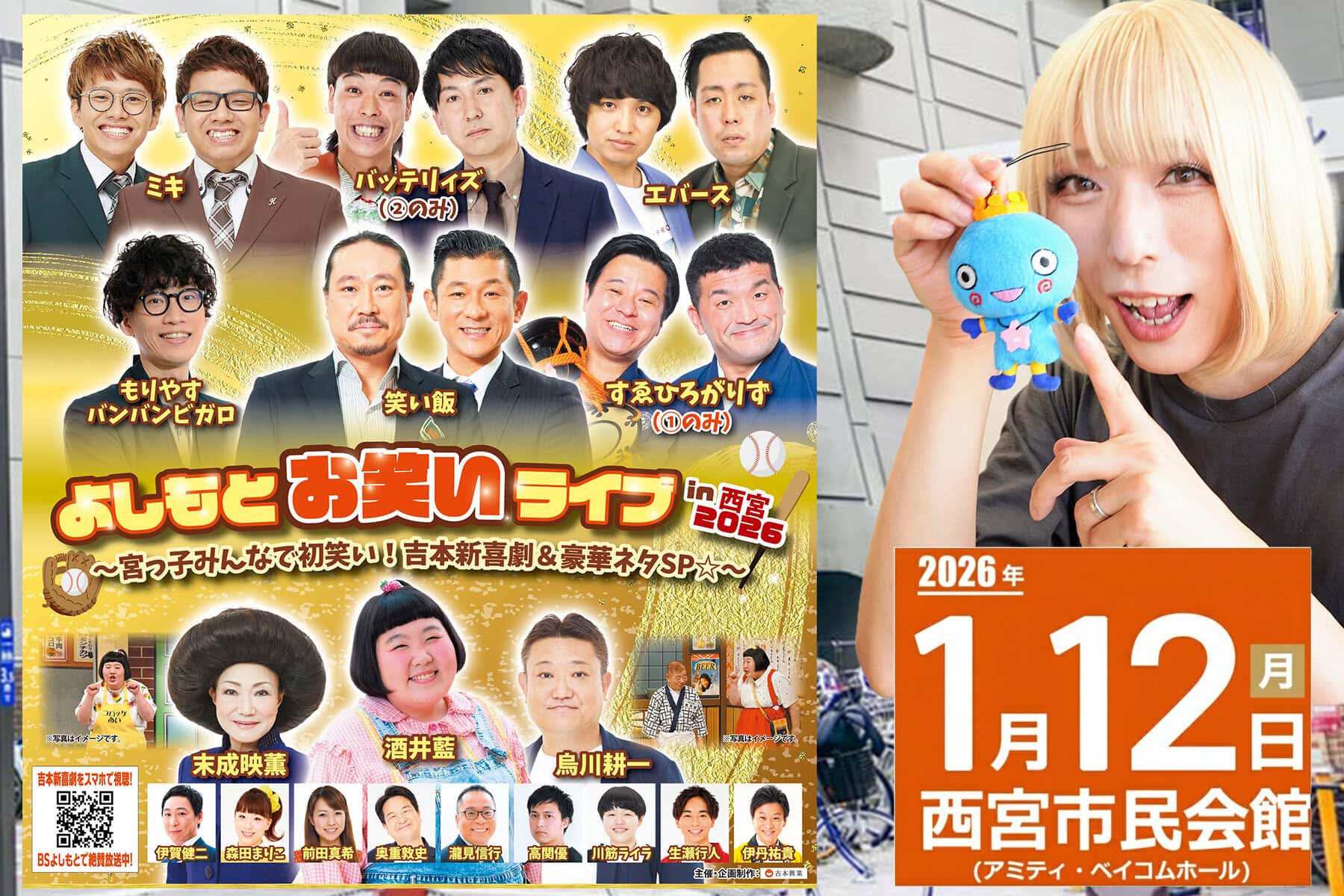 2026年1月12日(月・祝)にアミティ・ベイコムホールで「よしもとお笑いライブ in 西宮2026」が開催されるようです〜!