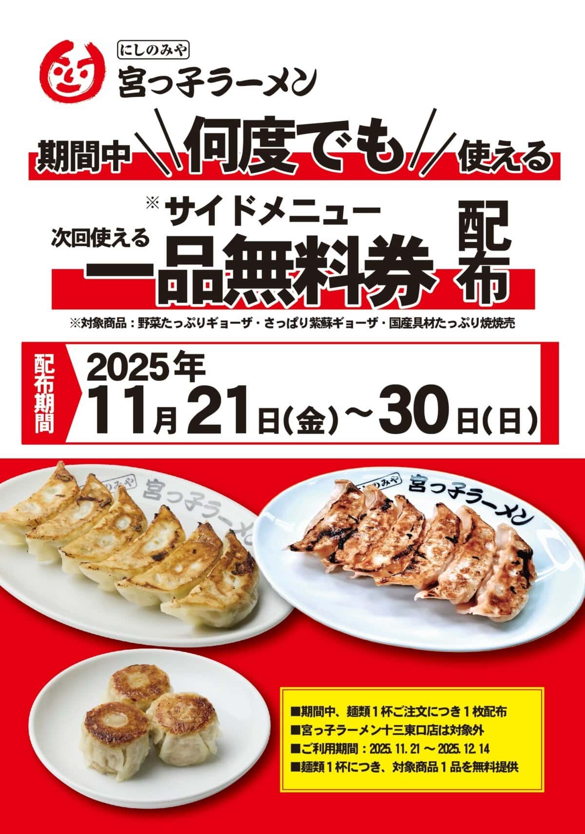 きょう11月21日(金)から宮っ子ラーメンで、サイドメニュー1品無料券もらえるようです。