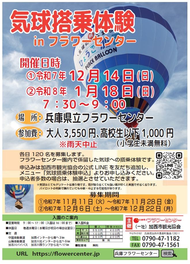 加西市ですが、12月14日(日)、兵庫県立フラワーセンターで「気球搭乗体験」が開催されるようです。