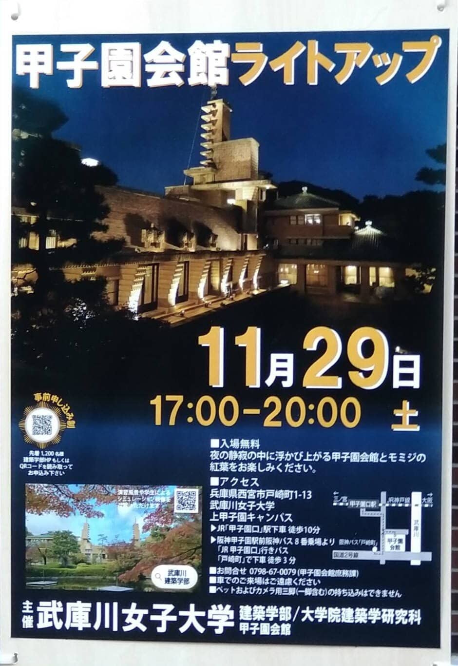 武庫川女子大学上甲子園キャンパスで毎年行われる「甲子園会館ライトアップ」が今年も開催されるようです。