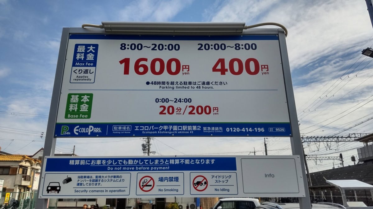 新しいパーキングの料金はこんな感じ。基本料金20分200円。最大料金は日中1600円、夜間400円です。