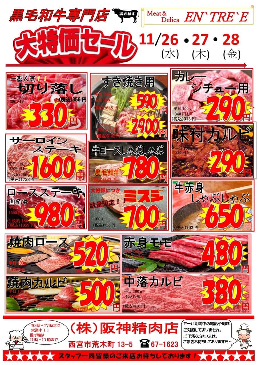 すご〜いすべり台のある公園「あらきの森公園」の横にある阪神精肉店「アン・トレ 」で11/26(水)〜28(金)の3日間限定の大特価セールをしています。