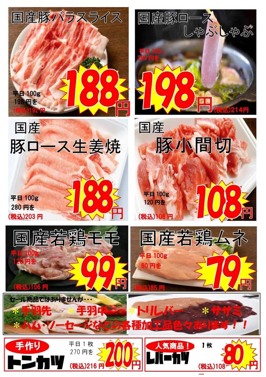 | 国産若鶏モモ100g | 120円 | 99円 | 約17%OFF |