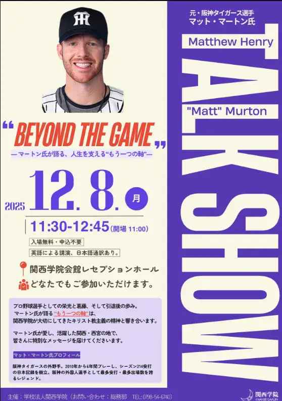 12月8日(月)、関西学院会館で元阪神タイガースのマット・マートン氏のトークショーが開催されるようです。