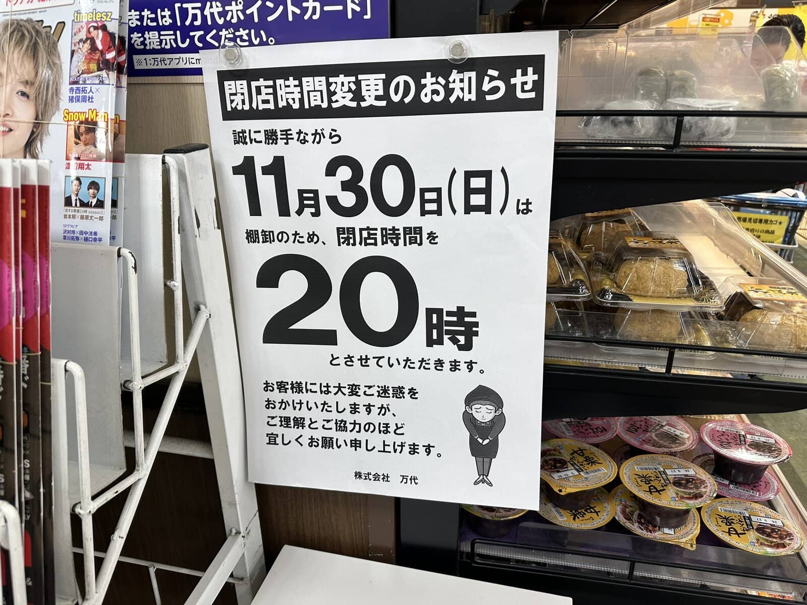 11月30日、熊野町の万代の営業時間が20時までに早まるみたいです。