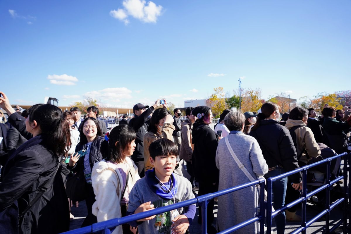 夢洲駅に降りるお客さん。この日は大阪府民1000人招待(申し込み人数16万6918人なのですごい倍率) 。当日9時半の夢洲駅の降車の様子。