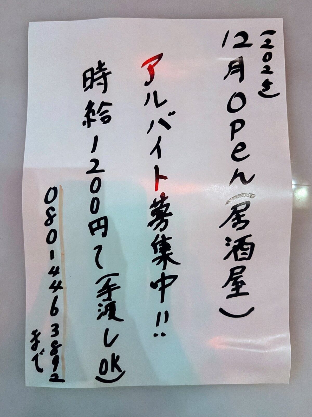 12月オープン予定とのことなので、もうすぐですね😄どんな店名で、どんなメニューがそろうのか。どんな雰囲気の居酒屋さんになるのかも気になりますね〜。また何か分かればお知らせします〜