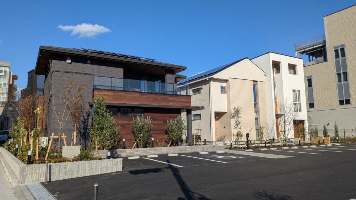 3棟あるうち両端の2棟が、脱炭素仕様の高性能モデルハウス、真ん中のお家が全館空調を体感できる宿泊モデルハウスなんだそう。