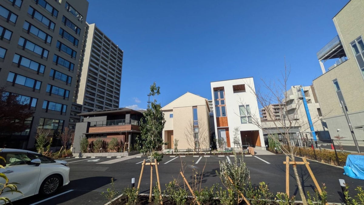 3棟のモデルハウスの北側にはこちらの事務所棟が建っています。災害時は避難スペースに、週末は親子向け知育セミナーも開かれるようですよ。