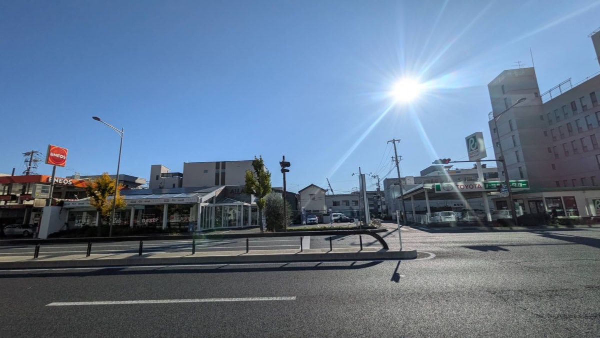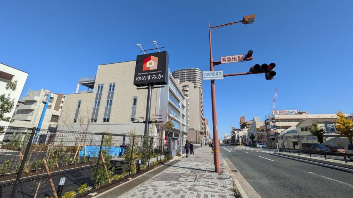 こっちに行くと、西宮消防署、ローソン、ラーメン荘これが好きだから、チャーハン研究所 明などがあります。反対方向に行くと、Chinese Kitchen 昇龍、フレンテ西宮、西宮駅前郵便局、CoCo壱番屋などがあります。