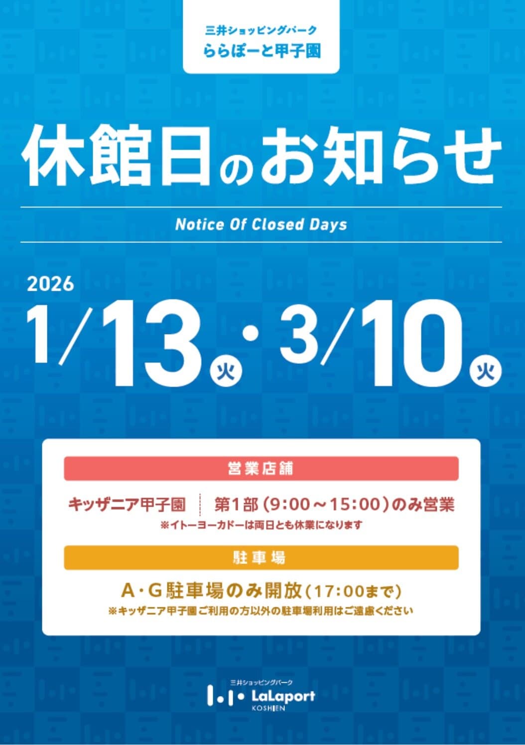 来年は1月13日(火)・3月10日(火)の2回休館するとのこと。イトーヨーカドーやキッザニア、駐車場も休館となります。