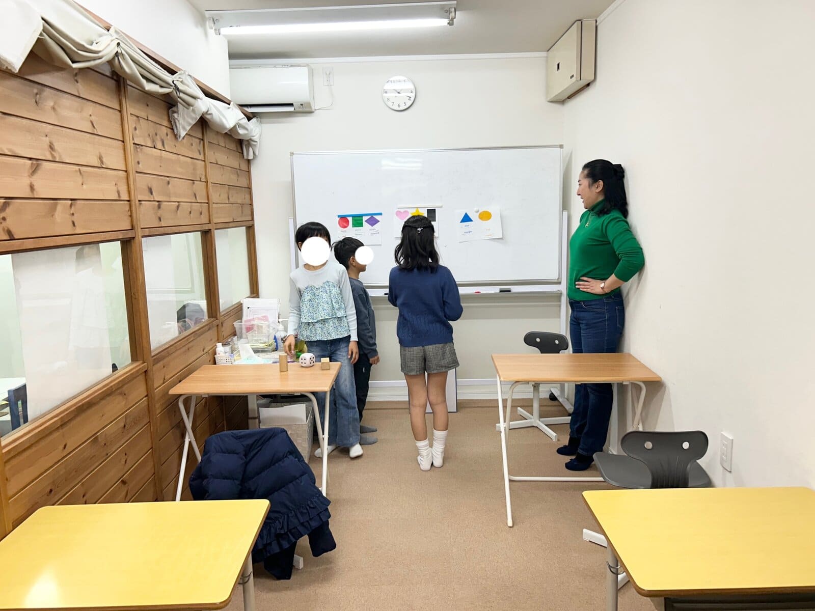 テーマは色と形。教室にあるいろんな色、形のものを1人が英語で伝えて、それがどこにあるかみんなで探すゲームをしていました〜🔵🟩🔶筆箱かな?ノートかな??