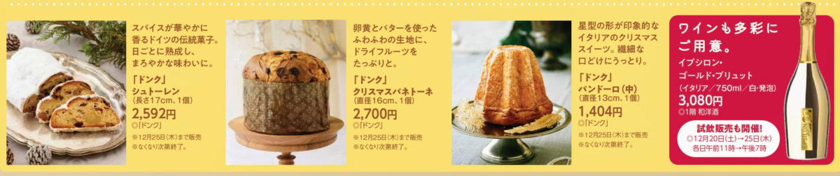 - パネトーネ=卵黄やバターを贅沢に使った生地にドライフルーツを加えて焼き上げた、イタリアではクリスマスに定番の伝統発酵菓子